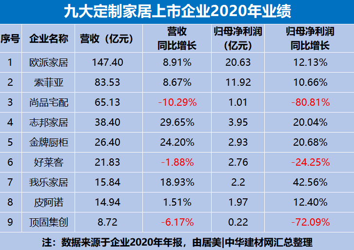 2021-05导读:截至4月28日晚,9大定制家居上市企业2020年年报已悉数出炉。2020年,共计实现营业收入约422.19亿元,增速平均上涨8.17%;实现归母净利润约47.59亿元,增速平均下滑6.52% 。