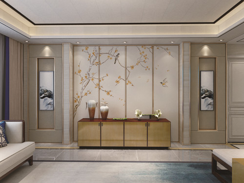 客厅•品味中式禅意之美,电视背景墙选择了中式的山水画,隐隐约约的青山连绵将人带入一种隐逸的环境中以金属线条将山水画的侧边进行延伸,是一种细腻的儒雅品味空间色调为冷淡色系,高级灰调加上中式装饰灯的点缀多了一种精致感。
